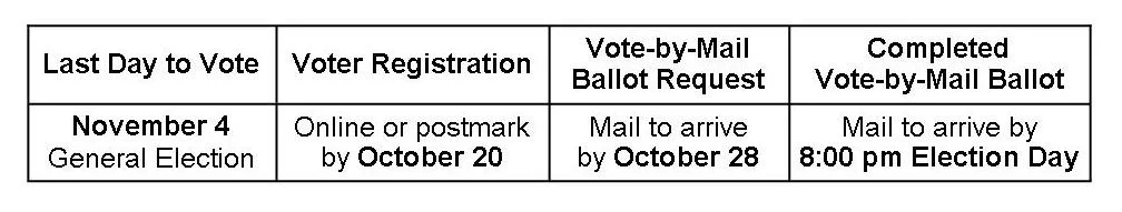 The last day to vote is Nov. 4. Polls are open on Election Day from 7:00 a.m. to 8:00 p.m.