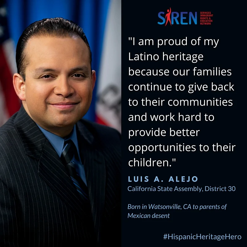"There are numerous reasons why I am proud of my Latino heritage. One reason is our families who continue to give back to their communities and work hard to provide better opportunities to their children. Growing up in a family that worked in agriculture, I was fortunate to witness the power of political activism at an early age. I watched as labor leaders Cesar Chavez and Dolores Huerta led the fight to gain workers’ rights for thousands of farm workers and why my grandparents joined them. It also inspired me to have a voice and developed a sense of personal commitment to helping my community. To this day, I am inspired by what I saw and am proud to have had a major impact on California by authoring Assembly Bill 10, which will once again raise the minimum wage on January 1st to $10 an hour, and Assembly Bill 60 which restored the ability of undocumented California residents to apply for a driver’s license. Over 500,000 immigrants now have a license and a better life!" - Assemblymember Luis Alejo